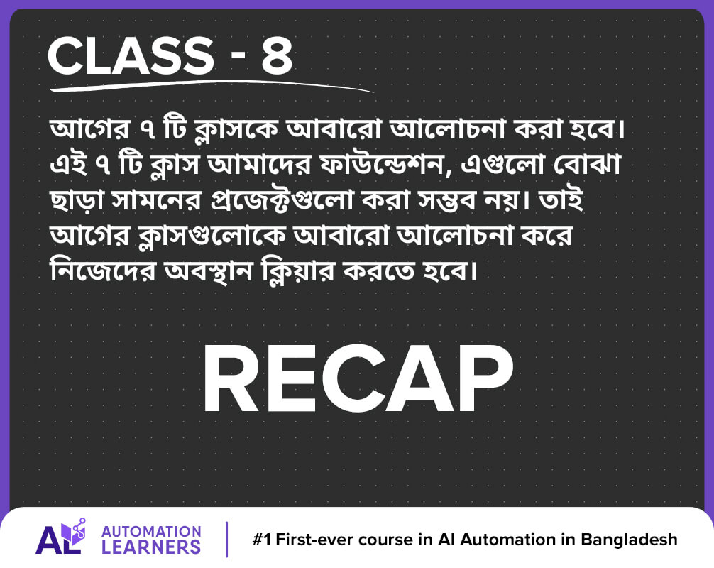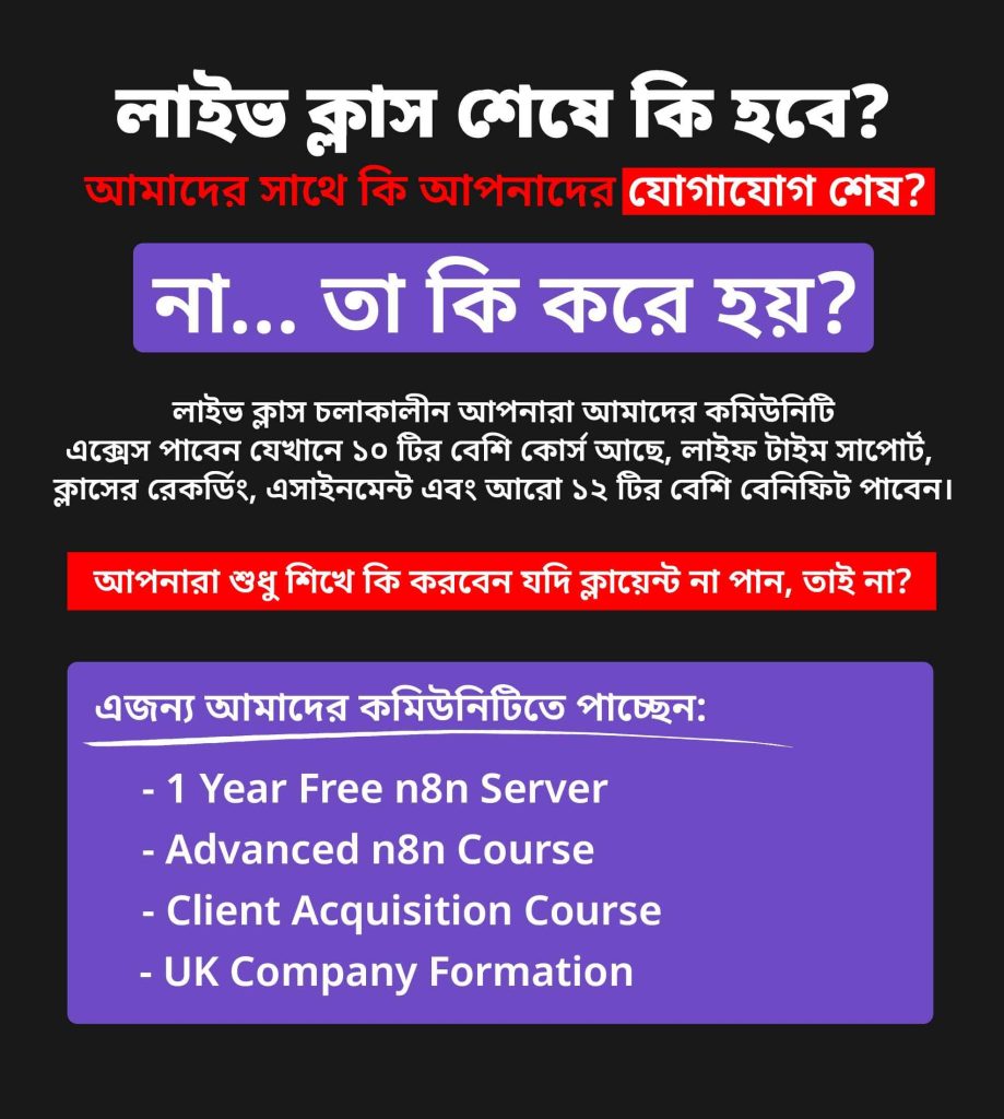 কিন্তু আপনাদের সকলকে নিয়ে প্রতি শুক্রবার রাত ৯ঃ১৫ মিনিটে একটা লাইভ ক্লাস করা হবে এবং সবার প্রশ্নের উত্তর দেয়া হবে, ছোট ছোট অটোমেশন তৈরী এবং টিপস শেয়ার করা হয়।